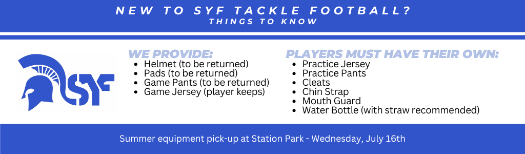 ALL tackle parents will be required to volunteer during the season: snack shack, chains, announcing and clean-up. This is a requirement of the season in order for your child to participate. All parents will be assigned a job throughout the season. Thank you for supporting our program.